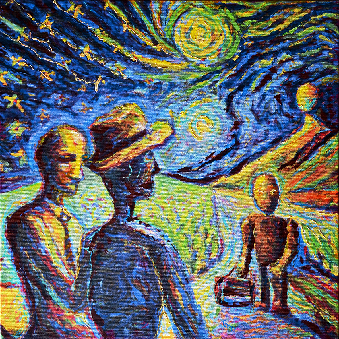 Sedamdeset godina kasnije, pokušavao sam da fragmente babine pripovesti povežem u slikovitu celinu, kao mozaik sećanja. Deda na slici je naravno sa sesirom, starim i iznošenim, jer je i spavao sa njim na glavi. Ujak je kao i uvek uljudan, pažljiv, druželjubiv i samilostan. Njegova mašna na pruge bila je poput vremenske trake koja nas sve povezuje. A sebe vidim, kao na jednoj izbledeloj fotografiji iz tog doba, sa nečim u rukama, nečim što možda zamenjuje trotinet. Vidim i svetle iskrice radosti, tuge, sna i jave – odraze sveta koji se tek otkriva preda mnom. Taj trenutak je, eto tu, zapečaćen u vremenu.