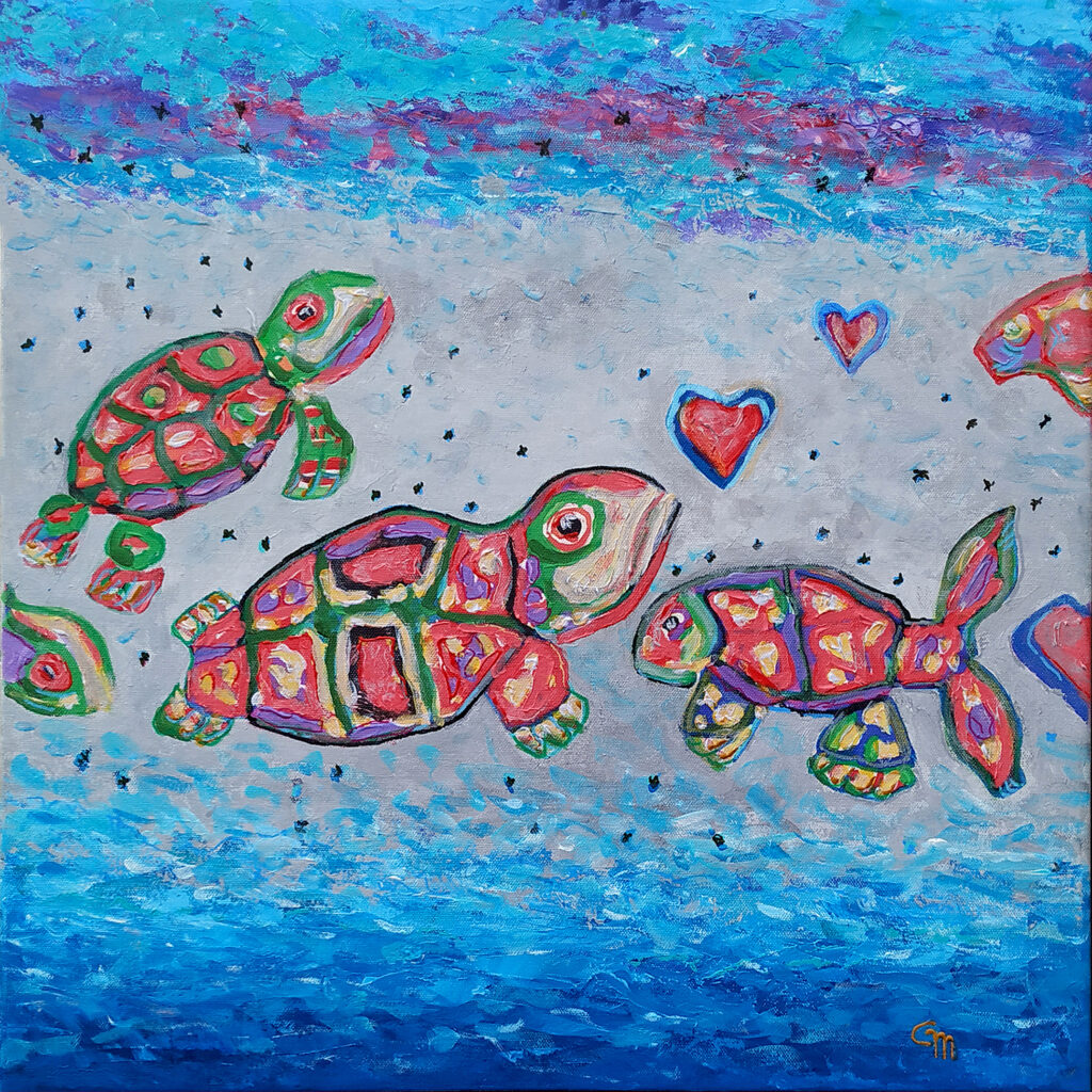 PRIČAM TI SLIKU (14).Avgust, godina 1983… Putovanje prema moru započelo je kao put ka Crnoj Gori, a nastavilo se sve do granica nepoznatog. Istovremeni poziv prijatelja iz daleke Dalmacije da svratim do njega mamio je poput toplog zagrljaja. Vozio sam fiću nesalomivog, koji nikada nije otkazao. Da mu nije bilo stalo do nekoliko litara benzina na sto kilometara i par krigli vode na svakih hiljadu, moglo bi se pomisliti da se kreće snagom čiste volje. Putovao sam s njim kroz čitavu Jugoslaviju i usred avgusta stigao u Bribir.Dalmacija, divlja i krševita. U dvorištu mog domaćina jedva poneki busen trave; ostatak je bilo kamenje, kamenje i još kamenja. Na kraju dvorišta mala ograda, naravno od kamenja, a unutra – tri kornjače… ili, gle!, proviruju još dve, sitnije, stidljivije. Prvi put sam video kornjače uživo, i nakon ručka sam opet bio s njima, uživajući u njihovom opuštenom životnom ritmu.Najveća, domaćin veli da se taj oklopljeni dasa zove Tiberije, uporno pokušava da naskoči na neku od dveju prisutnih dama: jednu što ćuti i sve trpi, ona je Livija, ili drugu, vrtirepku, koja se uvek izmiče, prigodno nazvanu Venus. Doznajem i imena one dve stidljivije: Luna i Iris. “Ooo, zanimljive li predstave…”, verovatno mi je lice sijalo od oduševljenja, pa primetih da me domaćica, mlada žena, s čuđenjem posmatra: “gle čovika, navodni umjetnik, a zapravo je animalni voajer.”Slika koja je u mom umu započela tada, dovršena je tek prošlog leta. Prijatno sećanje, kao neka vrsta tihe melodije koja odjekuje kroz vreme, na taj način je pronašlo svoj put do slikovitog završetka.Eto, takva behu ta vremena.